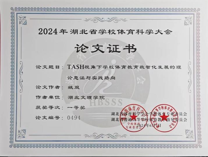 在读研究生姚双同学参加,并凭借其出色的论文《TASH视角下学校体育教育数智化发展的理论意涵与实践路向》荣获大会一等奖。