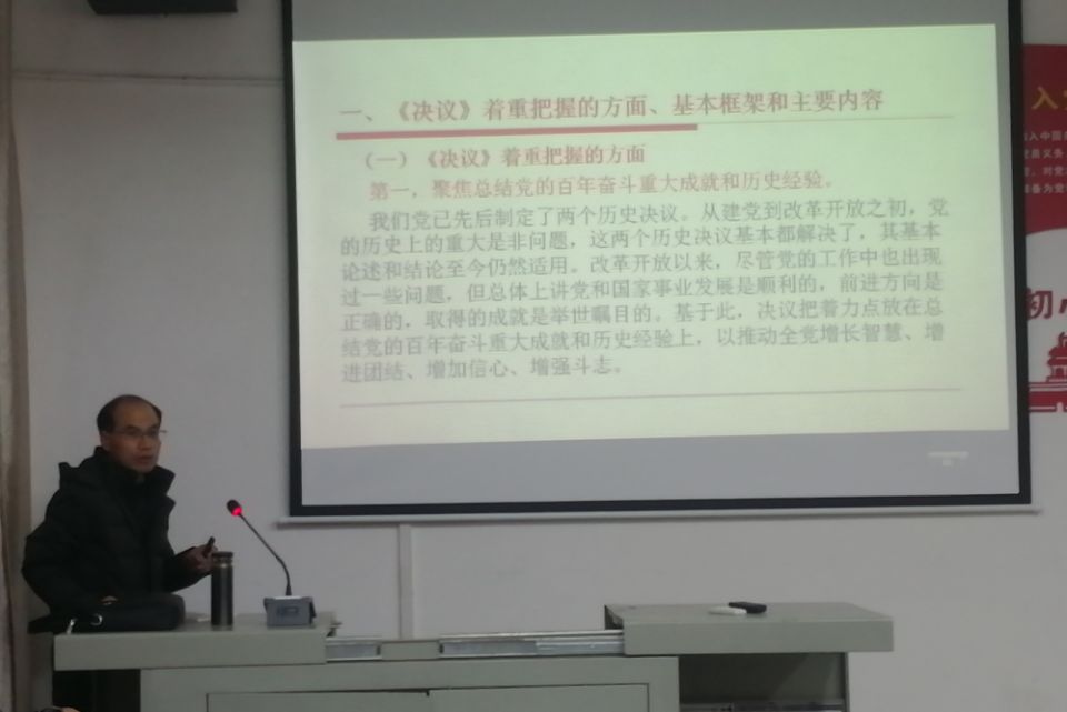 宣讲十九届六中全会精神,学院全体教职工参加了宣讲会,会议由党委书记袁红星主持。