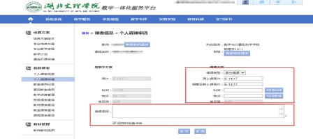 1)在调课类型中选择“部分调课”,调整部分周次的课程。在“原上课周次”栏中输入需要调整的周次,根据需求点击“可用时间”或“可用教室”选择调整后的时间或地点,填写“调课原因”后点击“保存”即可。
