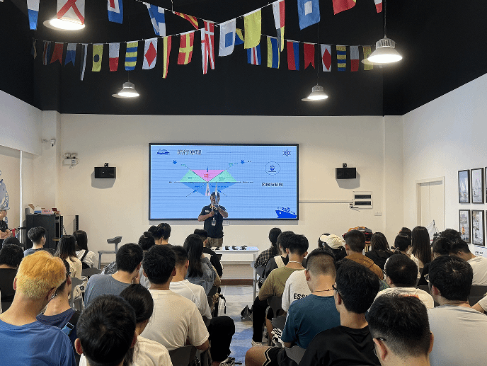 什么是帆船?在海上水手们是怎么给绳子打结的?在帆船知识的课堂里,帆船教练从帆船的分类、帆船船体结构的认识、帆船比赛航行视频等方面的讲解,向同学们展示帆船运动的知识、特点和独特魅力。同学们在教练的指导下争相展示自己的课堂所学,将打了8字结的绳子举过头顶,似乎在说:“看!我可以出海了!”。