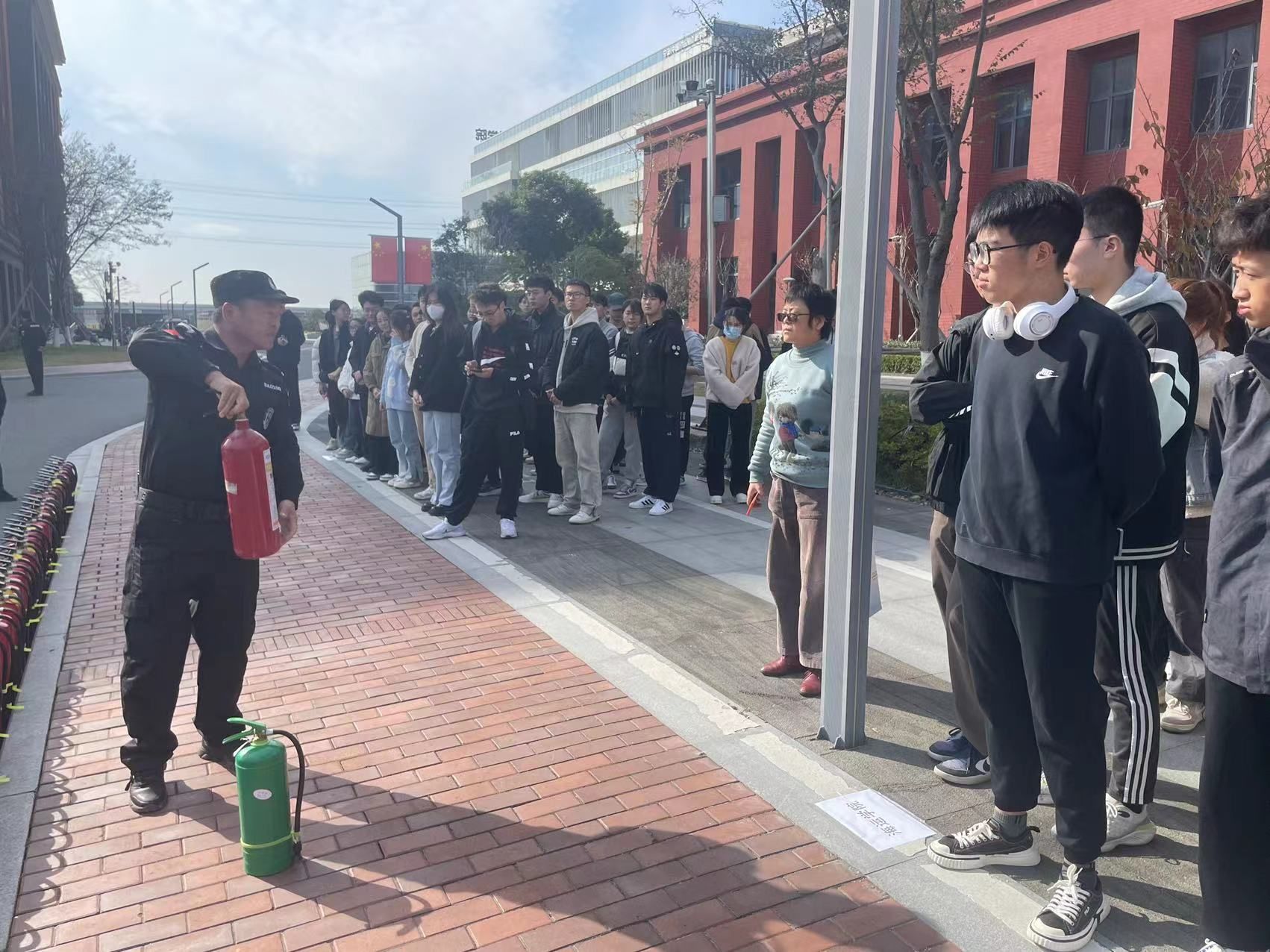 随后,专业人员在行政楼前给大家介绍了灭火器的分类,演示了灭火器的操作步骤,包括拔掉保险销、对准火源、均匀喷射等关键动作。特别强调了在紧急情况下正确操作灭火器的重要性。通过近距离、沉浸式的互动学习,在场师生们对消防器材的使用方法和使用技巧有了更加深刻的认识。接着,大家踊跃有序地进行了现场灭火的实际操作。
