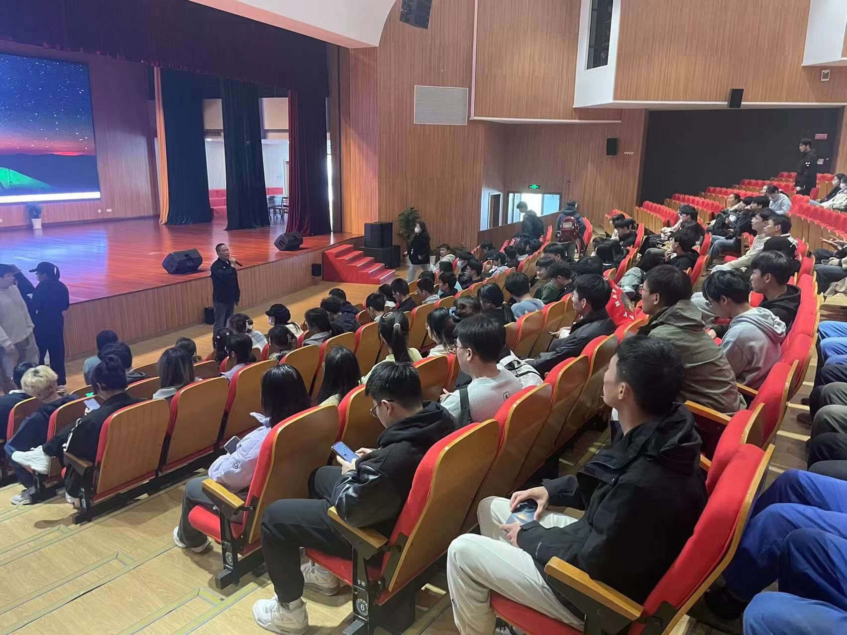 本次演练分为两个部分:应急疏散演习和现场灭火操作展示,分别在叶袁玉卿会堂和行政楼前顺利展开。在应急疏散演习中,听到火警警报后,学生们在专业人员的引导下,按照预定的疏散路线迅速而有序地离开会堂和楼宇。期间,学生们捂住口鼻,模拟在浓烟环境中的疏散,演示了低姿态逃生和利用紧急出口标志的正确方法。
